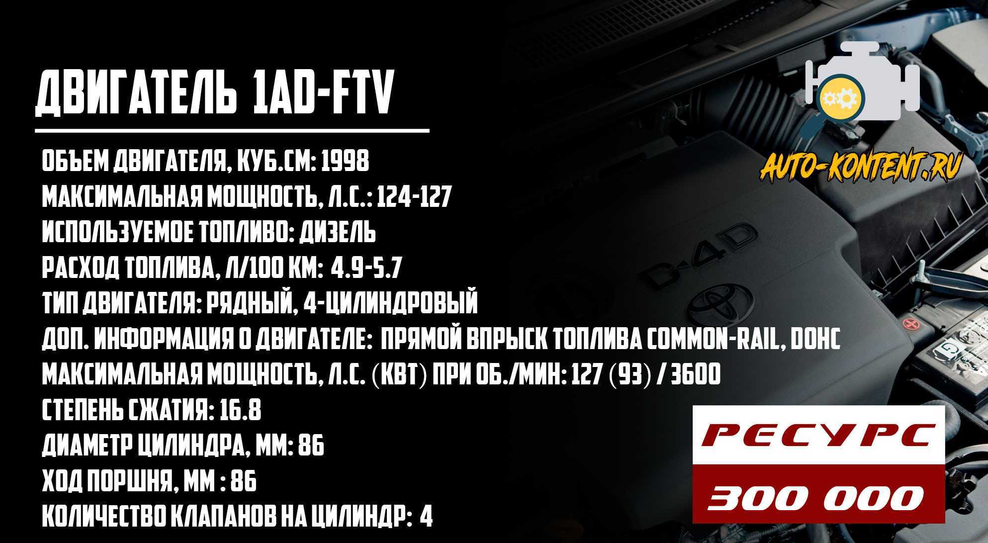 Этот двухлитровый дизель, получивший обозначение 1AD-FTV, выпускался до 2018 года, начав его производство в 2005 году. Им оснащались автомобили Toyota для европейского рынка. Со временем его довели до стандарта Евро-5, хотя изначально он соответствовал Евро-4. В результате изменений электромагнитные форсунки были заменены на пьезоэлектрические. Это 4-цилиндровый рядный силовой агрегат, получивший 16-клапанную ГБЦ. Мощность составляет 122-127 лошадиных сил, а крутящий момент — 310 Нм. Диаметр цилиндра равен ходу поршня: 86 мм.