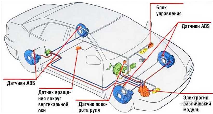 Остановка автомобиля реализуется через модулятор узла АБС, который создает правильное давление в системе торможения. Далее ESP передает блоку управления мотором команду на снижение уровня подачи топлива и уменьшение колесной тяги.