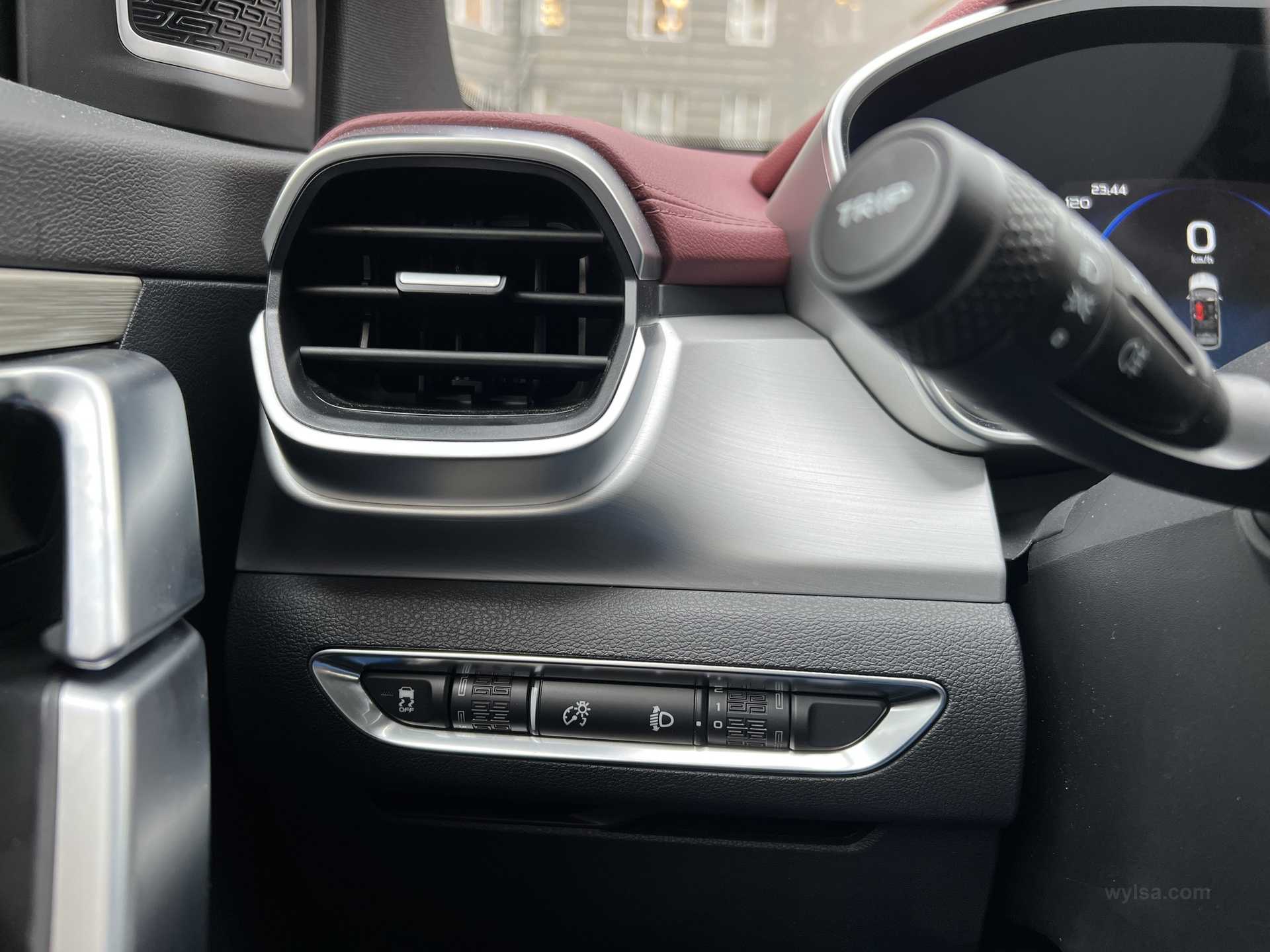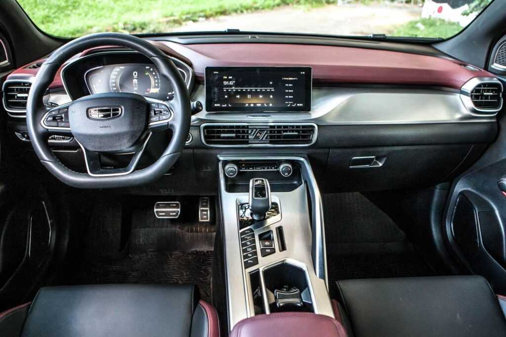 Непосредственно перед водителем установили 3-спицевое мультифункциональное рулевое колесо, немного усеченное в нижней части. Оно получило алюминиевые вставки. За ним разместили 7-дюймовую электронную приборную панель, имеющую несколько режимов отображения. Если раньше китайские автомобили имели плохо читаемую «приборку», в Geely Coolray от этого недостатка смогли избавиться. Украшают интерьер дефлекторы вентиляционной системы, имеющие хромированное обрамление.