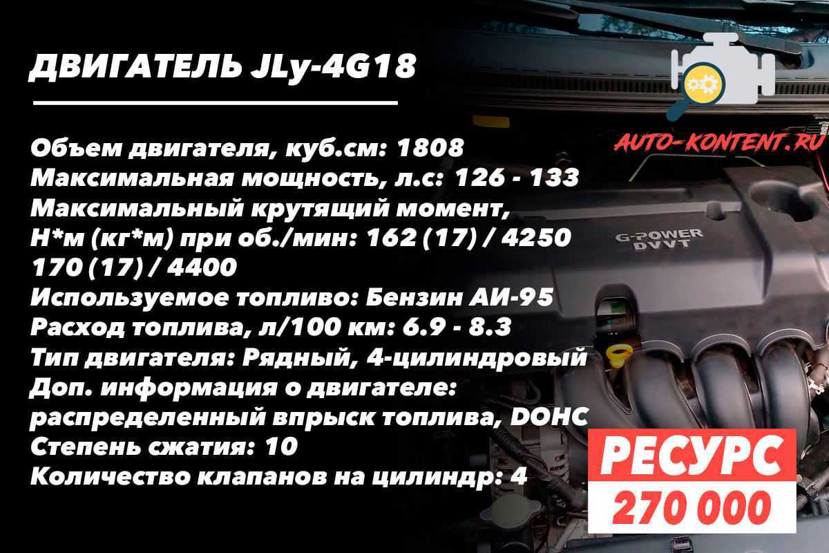 Рядный четырехцилиндровый мотор собственной разработки компании Geely, но с оглядкой на конструктивные особенности японского 1Z-FE. Корпус двигателя выполнен из алюминия, головка блока цилиндров 16-клапанная также изготовлена из алюминиевого сплава. Мотор отличается сравнительно небольшим весом, чего китайцам удалось достичь за счет уменьшения числа деталей с одновременным сокращением их массы. Чугунные гильзы запрессованы в цилиндры, что несколько усложняет процедуру проведения капитального ремонта в случае необходимости. Газораспределительный механизм также обычный – стандартный DOHC, который определяет наличие верхнего и нижнего распределительного вала. Мотор JLy-4G18 получил технологичные системы VVT-I (постоянно изменяемые фазы на впускных клапанах) и систему распределенного впрыска топлива.