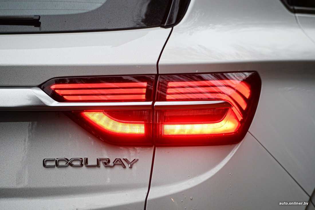 Задняя часть получилась довольно простой, без лишних элементов. Крышка багажного отделения стоит высоко, что также положительно отразилось на удобстве погрузки багажа. Уже в стандартной комплектации Джили Кулрей кроссовер оснащен светодиодными стопами. Одну часть разместили на крышке багажного отсека, а вторую на кузове. Для придания свежести машине инженеры компании решили соединить стопы хромированной полоской, имеющей надпись компании в центре.