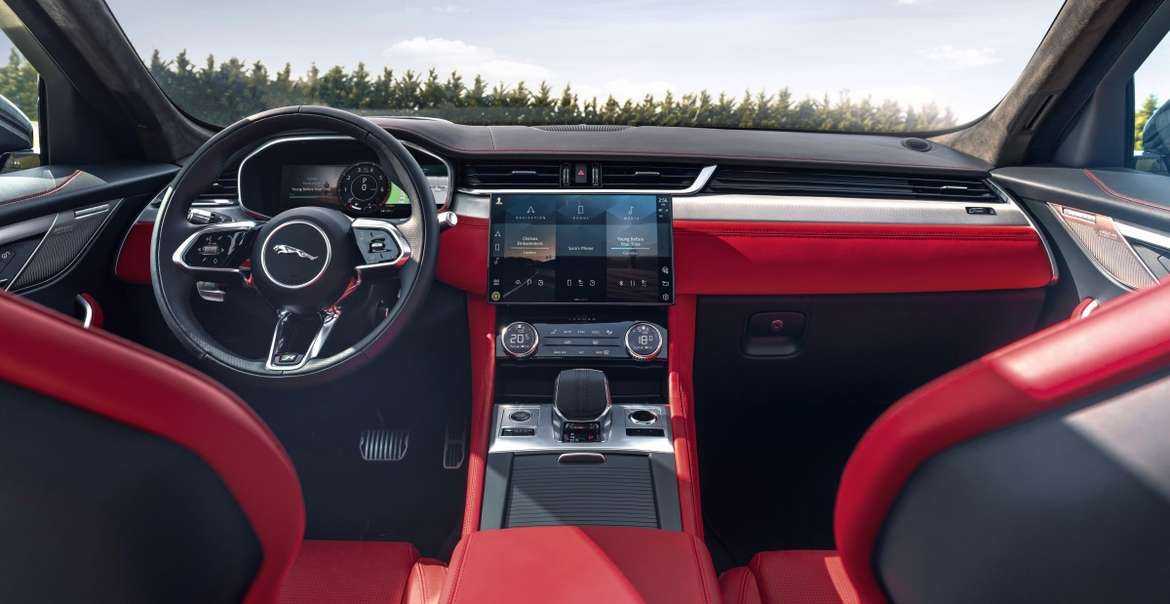 Интерьер F-Pace в процессе рестайлинга был полностью переработан – внутри автомобиль оформлен теперь в стилистике новейших моделей Land Rover и Range Rover. Передняя панель отныне в большей степени сориентирована на водителя, в ее центр встроен 11,4-дюймовый сенсорный дисплей высокого разрешения из изогнутого стекла в корпусе из магниевого сплава. Отделан салон кожей, натуральным деревом и алюминием; на корпуса динамиков и металлический селектор системы Jaguar Drive Control в виде шайбы нанесена лазерная гравировка.