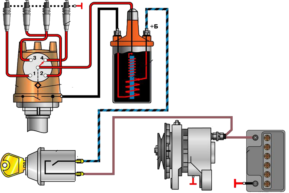 Система зажигания – воспламенение смеси. Комплектуется катушками и свечами зажигания, трамблёром и проводами.