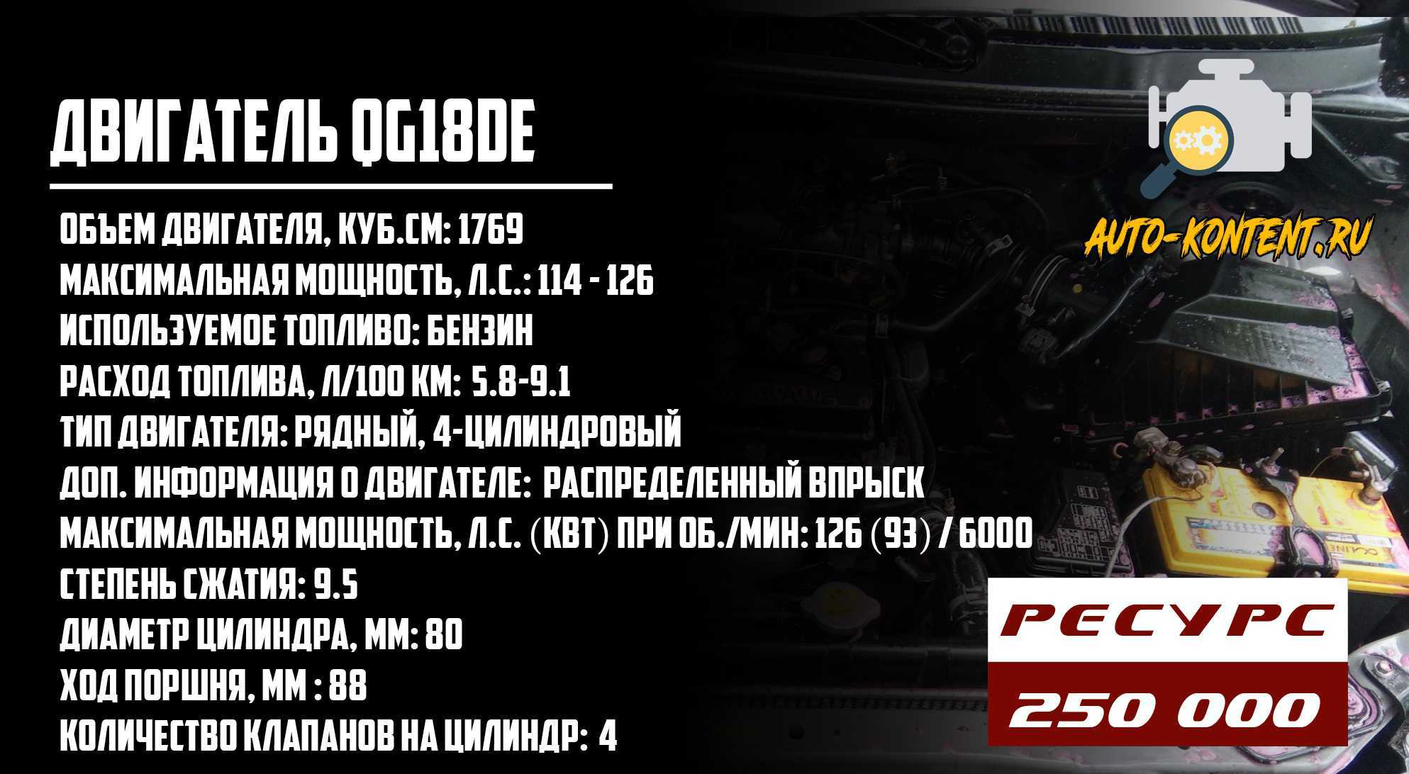В период с 1998 по 2006 год концерн Ниссан осуществлял сборку 1.8-литрового мотора под заводской маркировкой QG18DE. Этот агрегат стал основным для массовых автомобилей концерна – Примера, Альмера. Обычная рядная «четверка», изготовленная из чугуна с 16-клапанной головкой блока цилиндров. Цилиндры расточили под 80 мм, а поршень ходит на 88 мм. Здесь так же, как и в QG16DE, система распределенного впрыска топлива. Фактически это тот же самый 1.6-литровый под обозначением QG16DE, единственное изготовитель увеличил диаметр «котлов», как было сказано выше, до 80 мм (в прежнем ДВС диаметр 76 м).