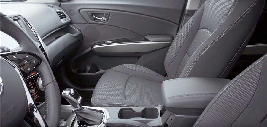 Обшивка интерьера SsangYong XLV 2018 зависит от комплектации кроссовера. В базе автомобиль получит качественную тканевую обшивку с черной или серой расцветкой. Кожаная обшивка будет доступна только в комплектации SsangYong XLV Luxury 2018. Как правило, боковые части обшивки сидений будут сплошными, а вот центральная часть перфорированной.