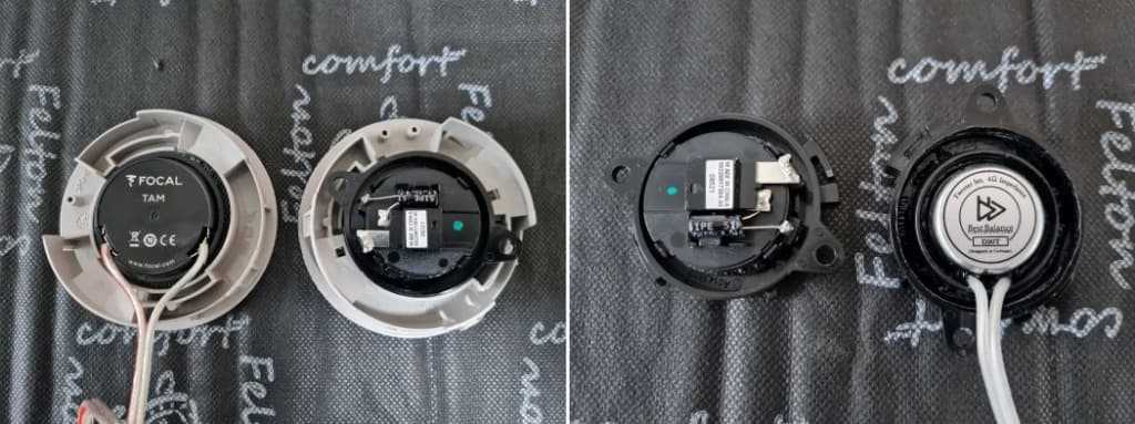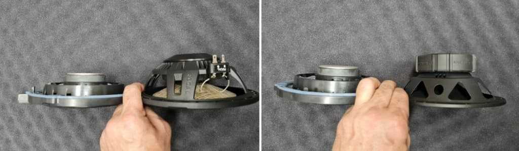 Ниже на фото снизу слева можно увидеть и сравнить размеры штатного мидбасового динамика и мидбаса от Focal серии FSE. На фото снизу справа тыловая акустика, штатная в сравнении с Best Balance. В случае с тыловой акустикой проблемы с глубиной нет, поэтому тут все проще.
