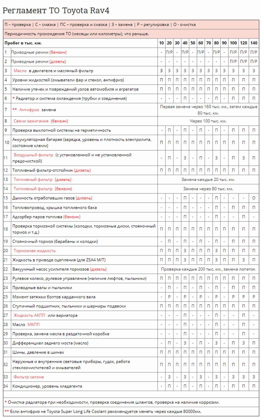 Регламент ТО Toyota RAV 4, таблица