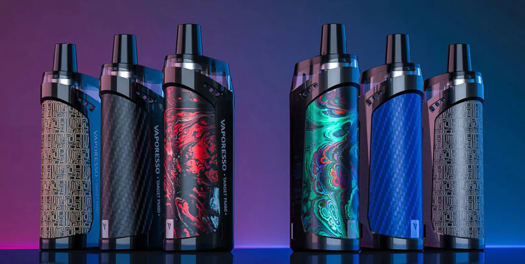 Target PM80 от Vaporesso – это одно из тех устройств, которые больше похожи на мини вейп, чем на традиционную под-систему. В этом корпусе от под-системы предусмотрен функционал полноценного вейпа. Устройство имеет прямоугольную форму с цветным TFT-дисплеем на передней панели, большой кнопкой fire над ней и двумя кнопками регулировки внизу.