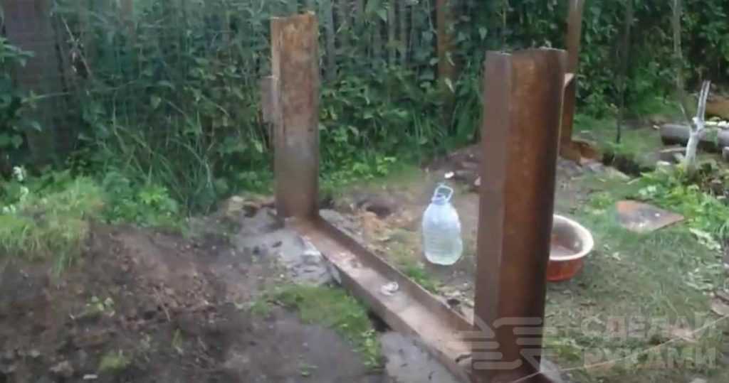 После этого устанавливаем опорные стойки. Они привариваются к горизонтальным опорам, которые автор предварительно забетонировал.