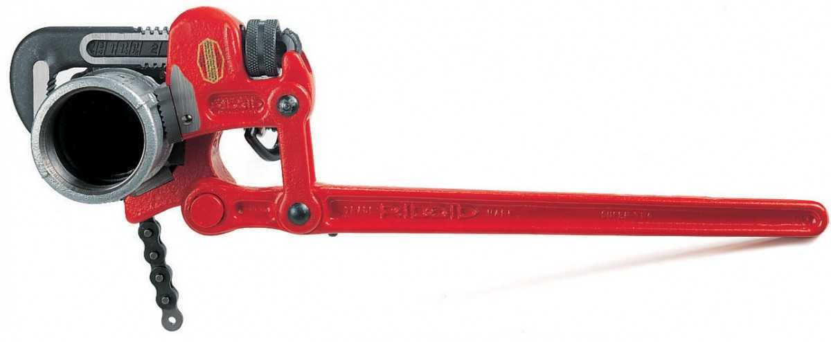 В цепном ключе используется цепь в качестве захвата и трещоточный механизм натяжения, позволяющий равномерно обжимать заготовку по всему периметру.