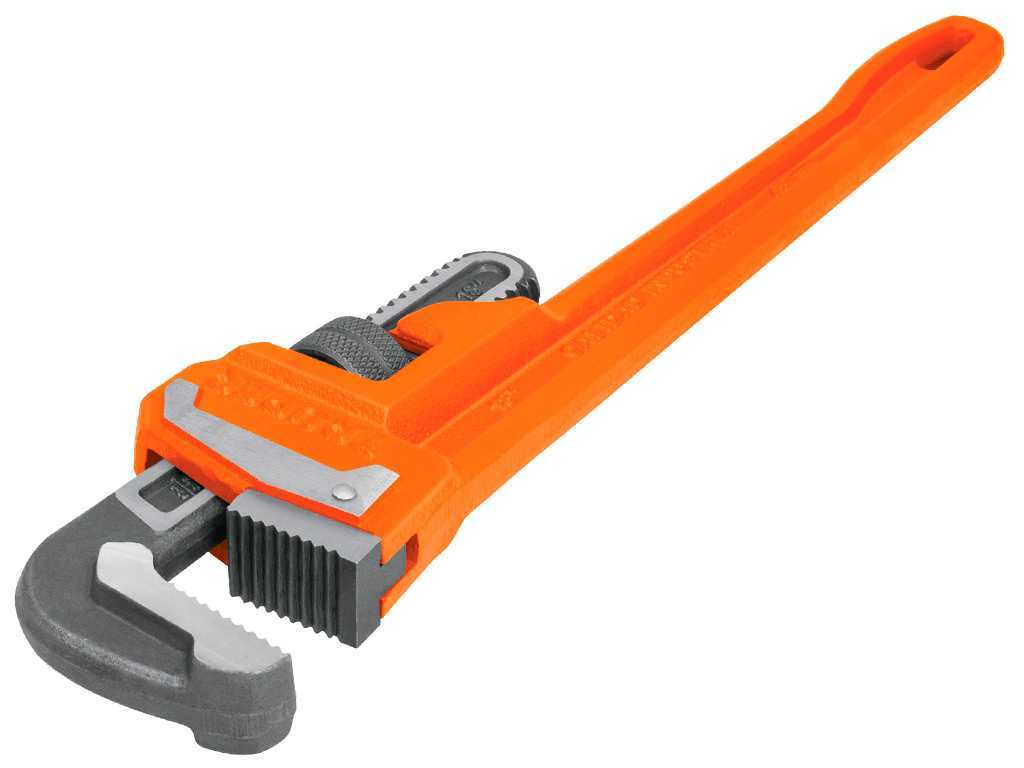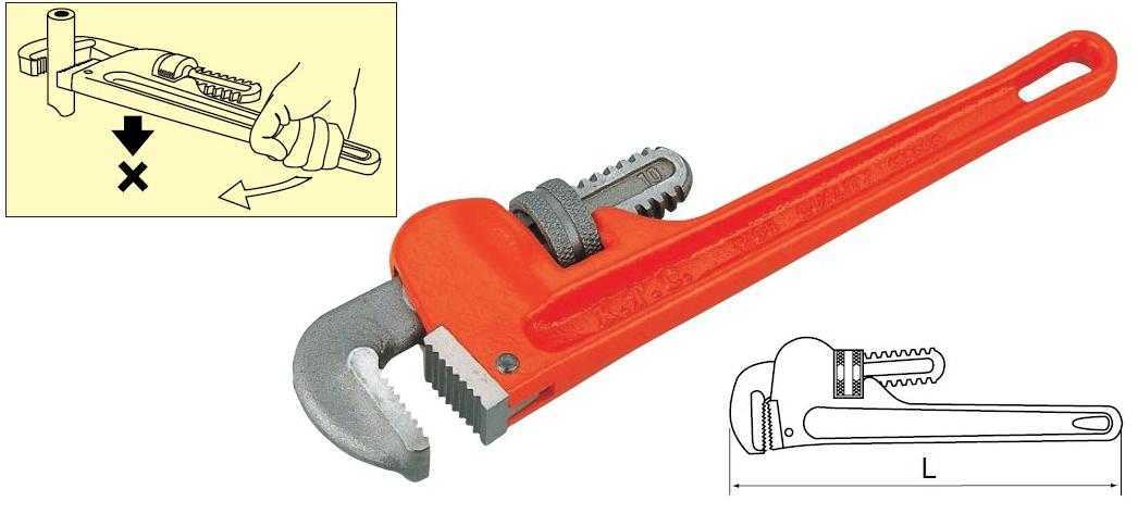 - Трубный (газовый) ключ. Еще один универсальный инструмент, позволяющий работать с любыми резьбовыми соединениями, трубами, фитингами, шпильками и т.д. Имеет широкий диапазон регулировок и длинный рычаг, позволяющий развивать большой крутящий момент.