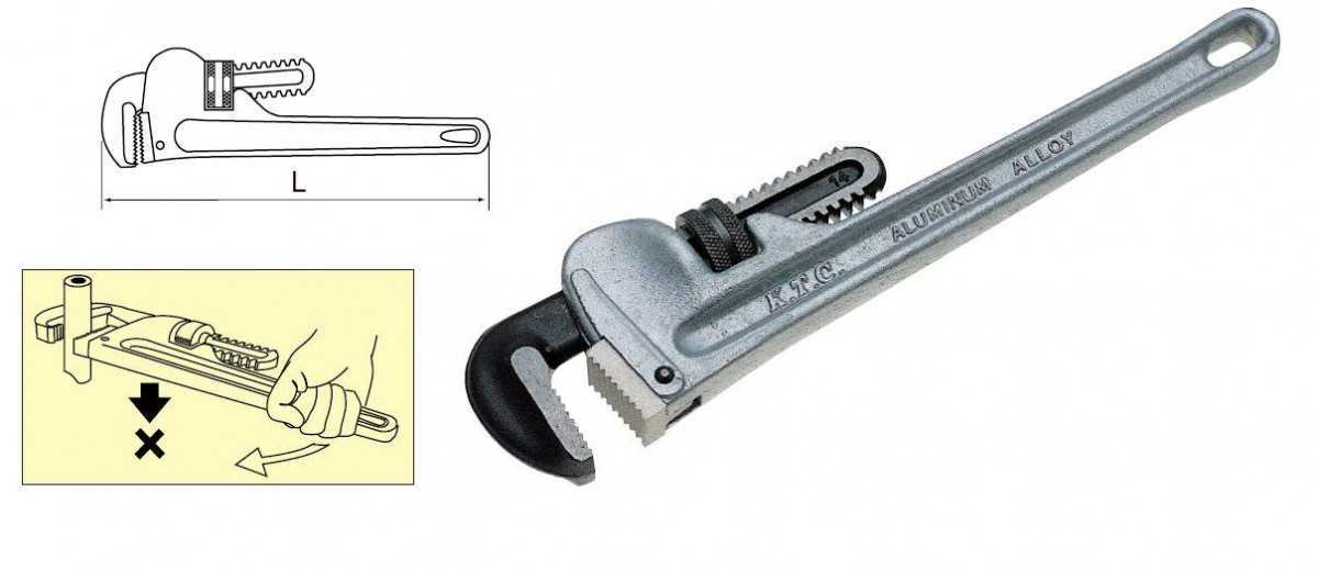 Основой ключа является неподвижный рычаг из стальной полосы. Он также может быть выполнен из отрезка корытообразно выгнутой листовой стали. К нему на шарнирах крепится поводок. В поводок продевается подвижный рычаг с крупной резьбой, изогнутый конец которой также оснащен зубцами. На него накручивается упорная гайка, при помощи которой задается требуемый раствор зева.