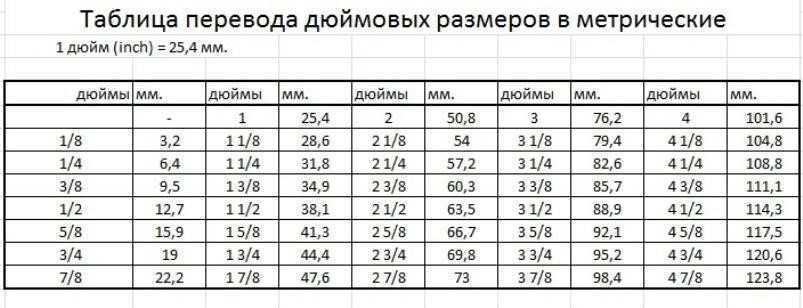 Если же под рукой не оказалось таблицы и вам необходимо перевести любой дюймовый размер, где числитель меньше знаменателя (правильная дробь), воспользуйтесь маленькой хитростью в виде формулы: 1 дюйм (25,4 мм) умножьте на числитель и разделите на знаменатель необходимого размера, в итоге получится размер в миллиметрах. Например, для размера 3/4”: 25,4*3:4 = 19,05 мм.