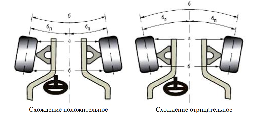 б – суммарный угол схождения колес; бл , бп — индивидуальные углы схождения