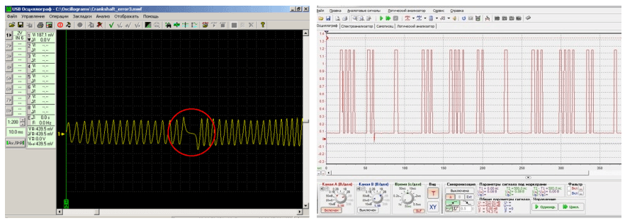 В сервисных центрах для диагностики параметров датчика синхронизации используют осциллограф, который позволяет замерить стабильность характеристик. На итоговых диаграммах можно четко видеть провалы в получении сигнала, которые указывают на проблемы работы датчика или поломку зубцов синхродиска.