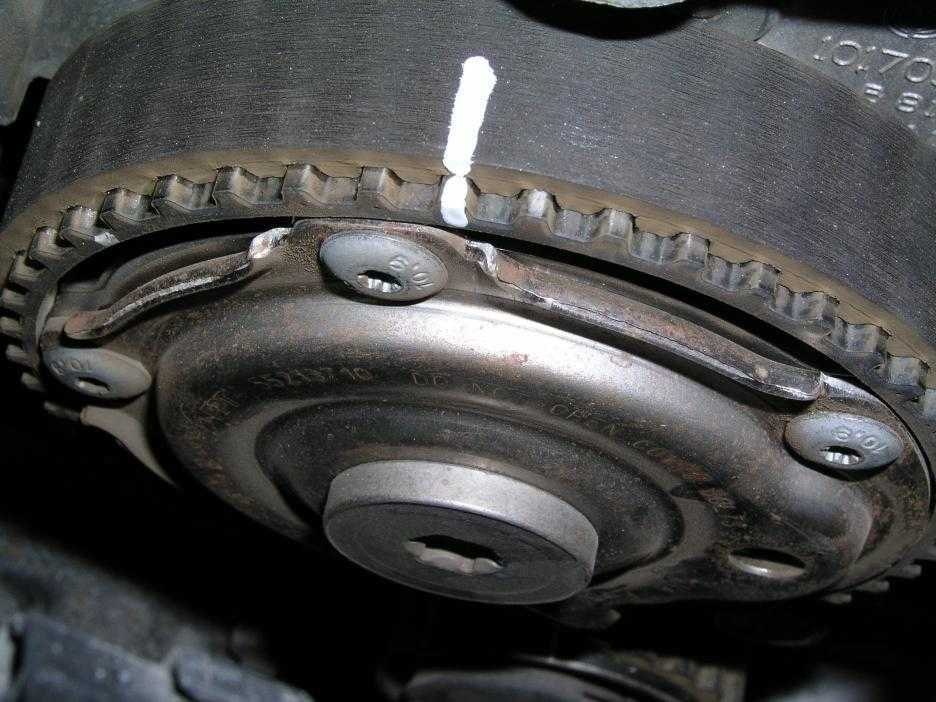 - После нахождения верхней мёртвой точки, немного поворачиваем распредвал, чтобы шкив сместился на 40-50° от ВМТ (это 2,5-3 зуба). Ставим свою метку, от которой потом будем вращать распредвал ещё несколько раз, делая дополнительные пометки;