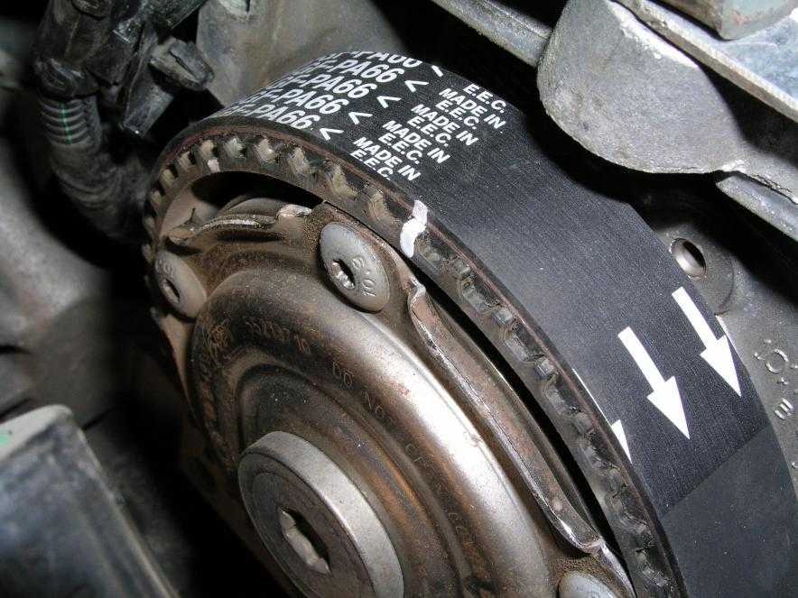 Совет-дополнение! Чтобы обеспечить 100% попадание зуб в зуб до снятия старого ремня белым маркером нанесите на него и зубчатые шкивы КВ и РВ две метки (см. фото 1,2). Снимите старый ремень и сравните его с новым, если тот не оригинальный (я ставил оригинальный, но всё равно не поленился пересчитать каждый зуб). Если всё ОК переносите метки на новый ремень, посчитав кол-во зубьев между метками на старом ремне или наложением, при этом направление стрелок на ремнях должны совпадать. Далее по плану, совмещая метки и сместив ремень до внутреннего края шкивов.