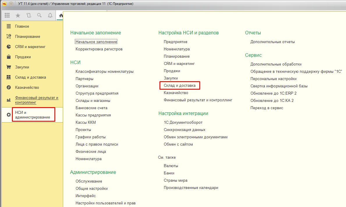 Первое это заполним Параметры обеспечения потребностей для центрального склада. Открыть параметры обеспечения можно из раздела Склад и Доставка — Сервис.