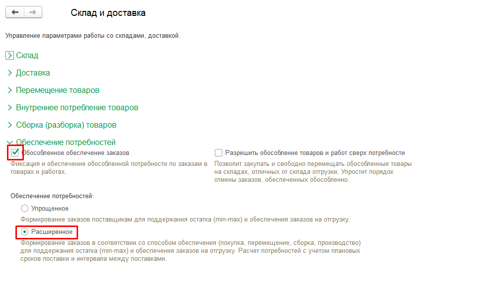 Остановимся на второй варианте, включим также Обособленное обеспечение заказов (разберем в следующем уроке):