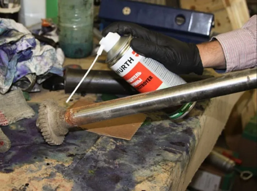 Для борьбы с ржавчиной и пригоревшими деталями используют смазку проникающего действия. Препарат выпускают в виде концентрированного раствора-эмульсии. Вещество обильно распределяют по проблемным поверхностям, выдерживают указанное в инструкции время и приступают к работе.