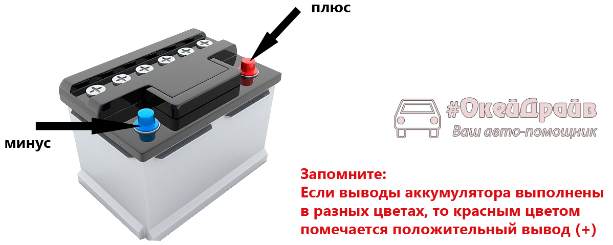 Плюсовая и минусовая клеммы аккумулятора.