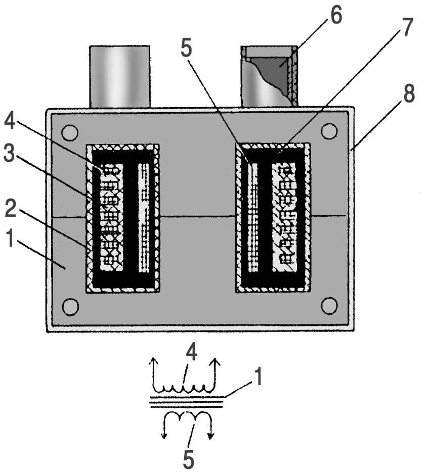 Рис. 9.86. Катушка зажигания: 1 — магнитопровод; 2 — корпус; 3 — катушка; 4 — обмотка вторичная; 5 — обмотка первичная; 6 — высоковольтный вывод; 7 — компаунд; 8 — скоба крепления |