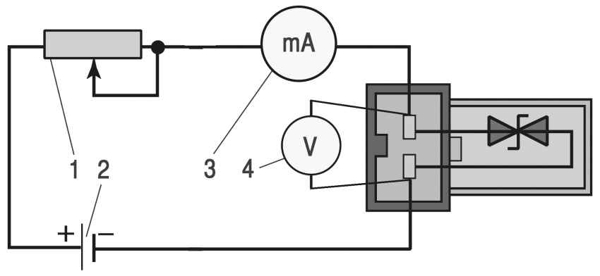 Рис. 9.85. Электрическая схема проверки датчика температуры: 1 — сопротивление переменное 10 кОм; 2 — аккумуляторная батарея; 3 — вольтметр, 4 — миллиамперметр; 5 — датчик |