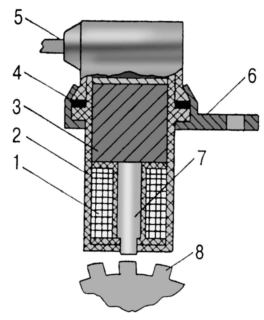 Рис. 9.83. Датчик положения коленчатого вала: 1 — обмотки; 2 — корпус; 3 — магнит; 4 — уплотнитель; 5 — привод; 6 — кронштейн крепления; 7 — магнитопровод; 8 — диск синхронизации |