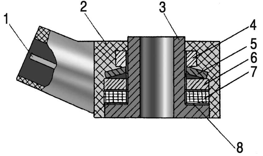 Рис. 9.84. Датчик детонации: 1 — штекер; 2 — изолятор; 3 — корпус; 4 — гайка; 5 — упругая шайба; 6 — инерционная шайба; 7 — пьезоэлемент; 8 — контактная пластина |