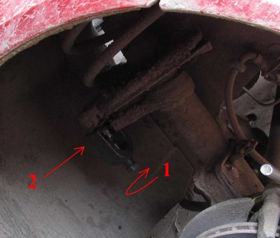 Чтобы минимизировать нарушение угла развала передних колес, кернером или краской наносим метки на болт верхнего крепления поворотного кулака и на кронштейн стойки.