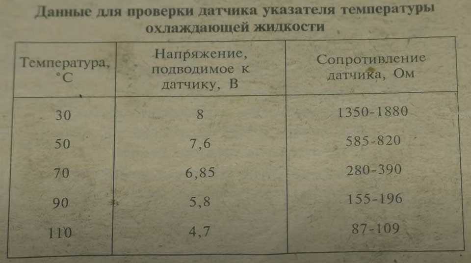 Затем постепенно повышая температуру жидкости сравнивать показания датчика и электронного термометра в соответствии с таблицей. Для большей точности фиксировать показания лучше через каждые 5 градусов. В итоге Вы получите данные которые можно занести в таблицу. Их впоследствии можно сравнить с информацией предоставленной в технической документации к конкретной модели авто. На крайний случай можно сравнить с таблицей приведенной выше.