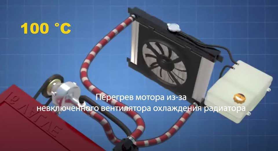 - При достижении теплоты антифриза 95-100 градусов запускаются система охлаждения (в противном случае охладитель начнет испарятся, что приведет к перегреву мотора). Для охлаждения используется вентиляторы, которые понижают теплоту охладители за счет вращения лопастей.