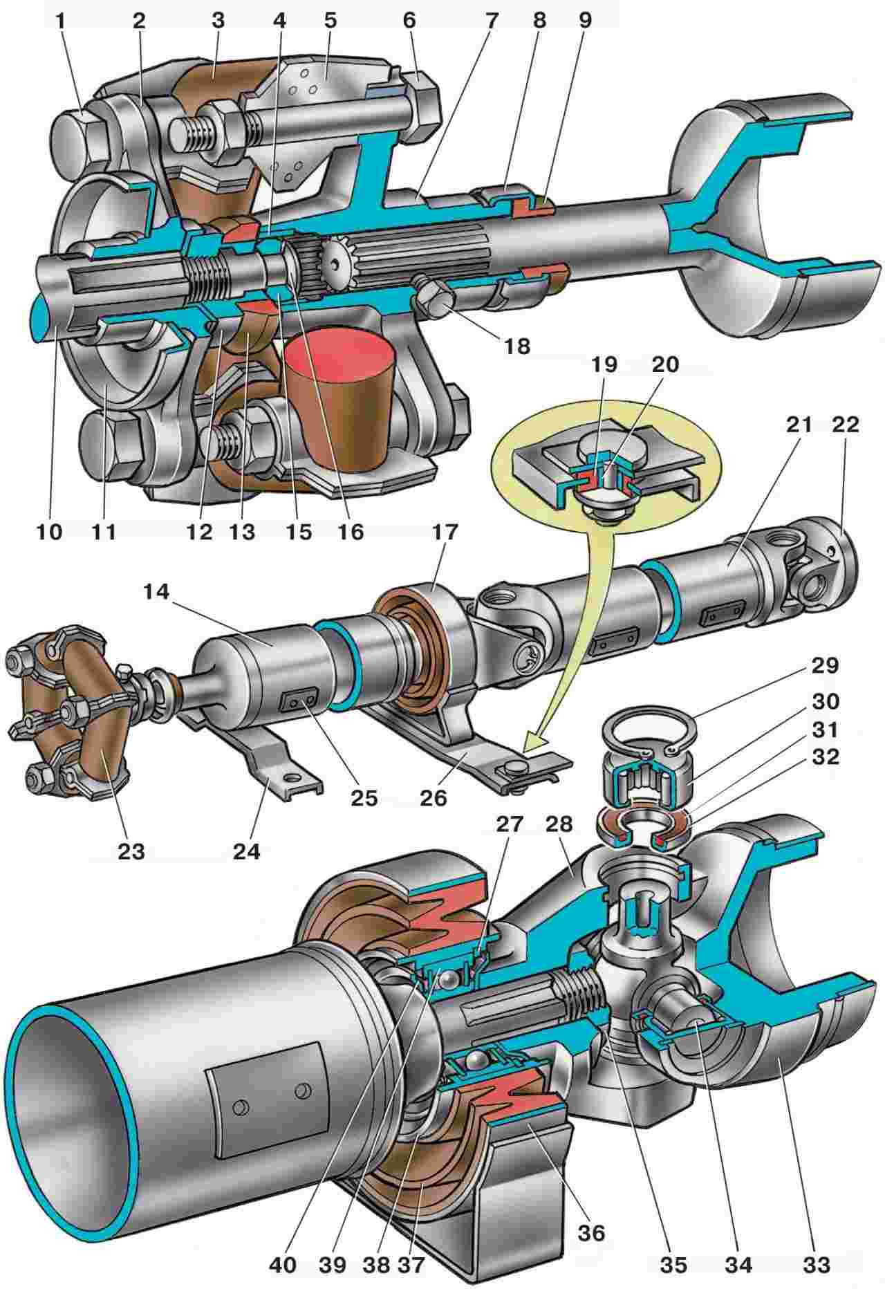 Наличие двух карданных шарниров и шлицевого соединения дает возможность передавать крутящий момент от коробки передач к главной передаче под углом, постоянно изменяющимся при работе подвески.