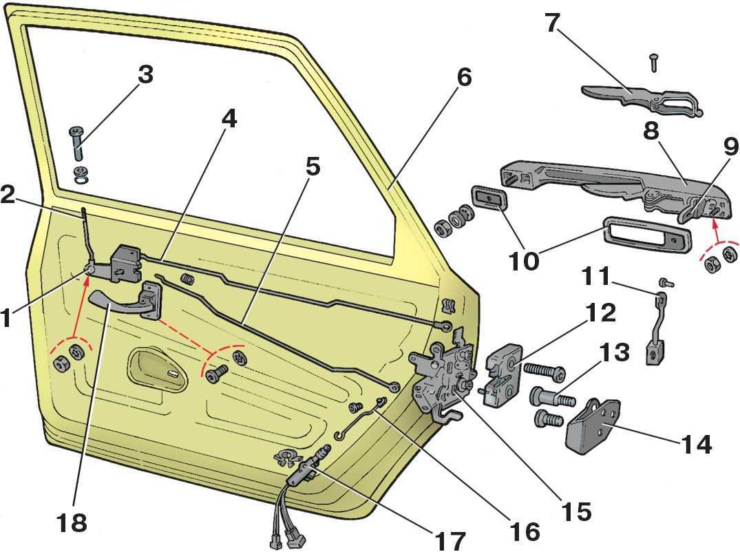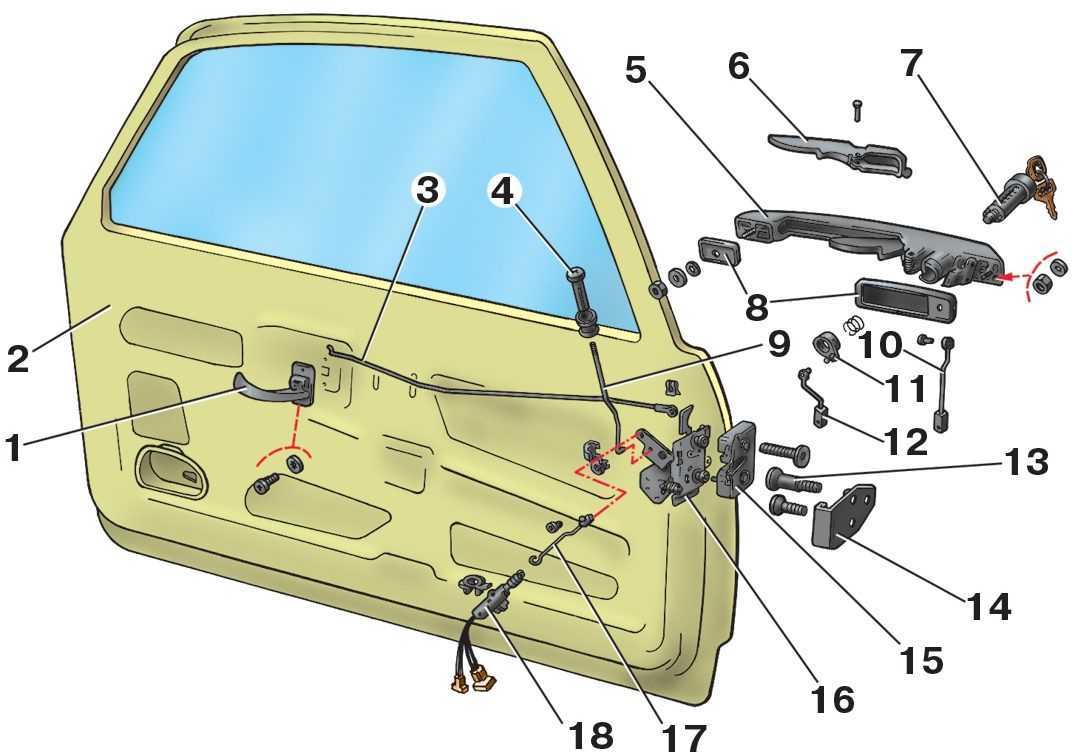 Рис. 8.17. Крепление замков и ручек передней двери: 1 – внутренняя ручка двери; 2 – передняя дверь; 3 – тяга внутреннего привода; 4 – кнопка; 5 – наружная ручка двери; 6 – клавиша ручки; 7 – личинка замка; 8 – уплотнитель ручки; 9 – тяга кнопки; 10 – тяга наружного привода; 11 – поводок выключателя замка; 12 – тяга поводка выключателя замка; 13 – палец фиксатора замка; 14 – корпус фиксатора замка; 15 – замок наружный; 16 – замок внутренний; 17 – тяга моторедуктора; 18 – моторедуктор блокировки замка двери |