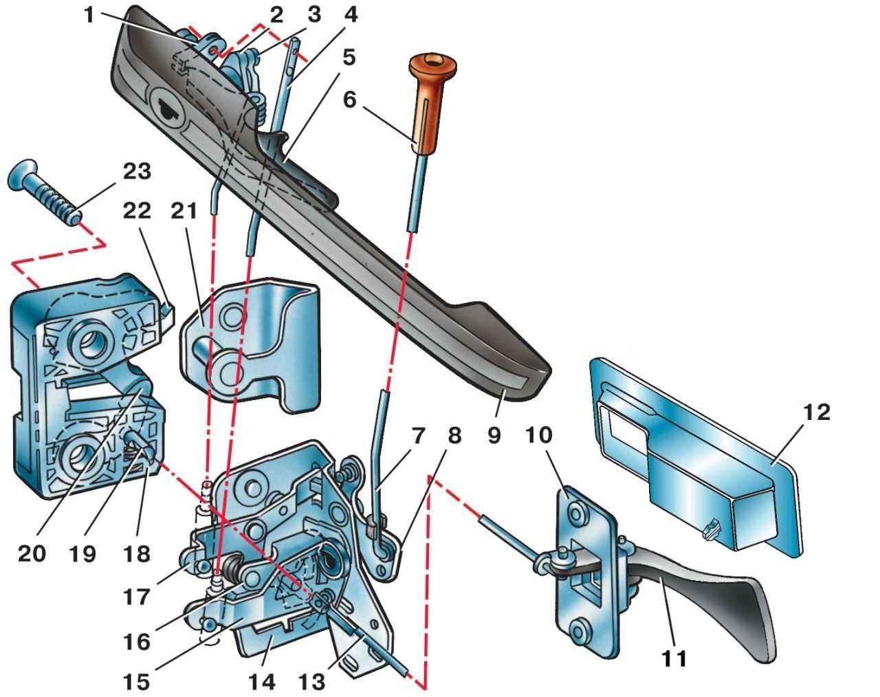 | Рис. 8.16. Замок передней правой двери: 1 – поводок клавиши; 2 – поводок выключателя замка; 3 – тяга выключения; 4 – тяга наружного привода; 5 – клавиша; 6 – кнопка выключения замка; 7 – тяга кнопки выключения; 8 и 17 – рычаги выключения; 9 – наружная ручка двери; 10 – кронштейн внутренней ручки; 11 – внутренняя ручка двери; 12 – облицовка внутренней ручки; 13 – тяга внутреннего привода; 14 – корпус внутреннего замка; 15 – рычаг наружного привода; 16 – промежуточный рычаг; 18 – корпус наружного замка; 19 – палец привода замка; 20 – собачка; 21 – фиксатор замка; 22 – храповик; 23 – винт крепления замка |