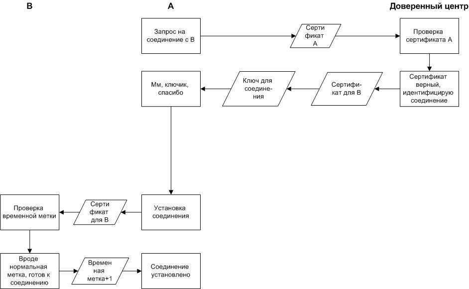 - А использует К для получения второго сертификата, предназначенного для установления соединения с В. У второго сертификата обозначено время жизни и временная метка, он зашифрован на ключе B.