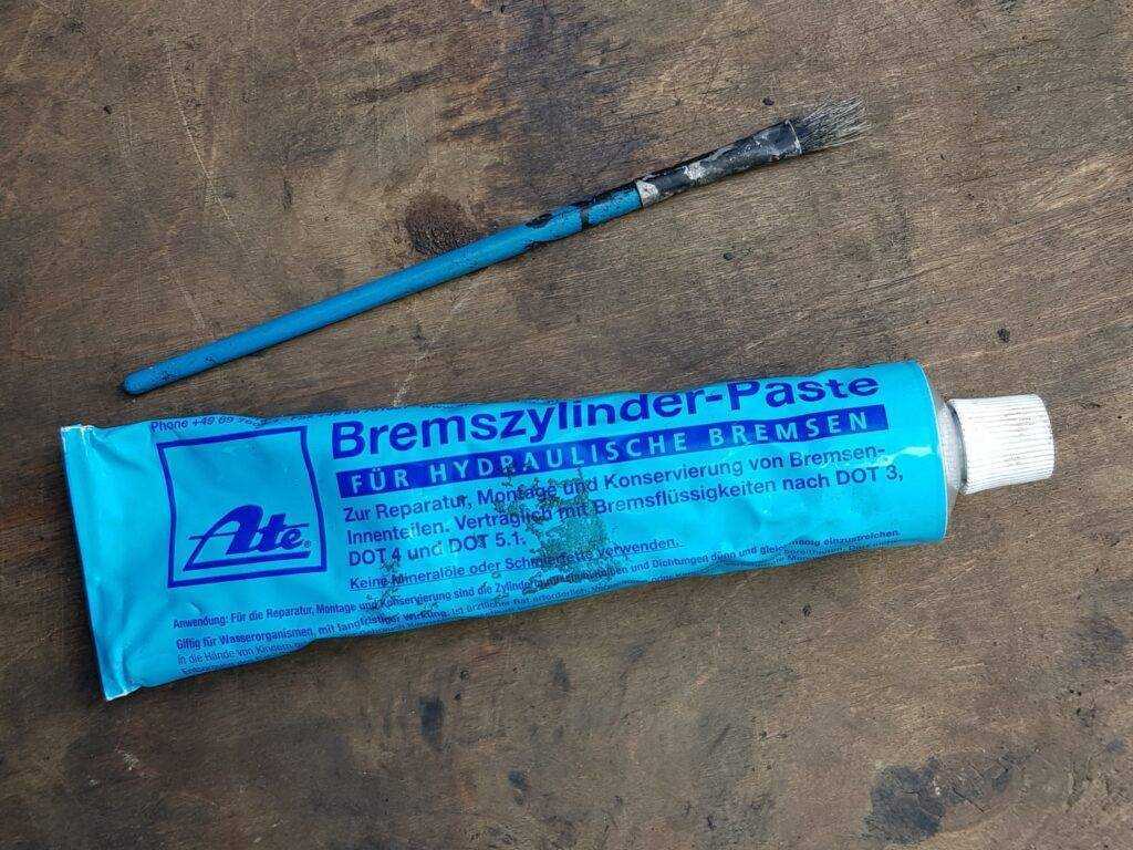 Первое. Использование специализированной смазки. Крайне рекомендую использовать пасту ATE Bremszylinder-Paste гидравлических тормозных цилиндров. Смазка превосходная для обслуживания дисковых и барабанных тормозных систем: высокотемпературная, устойчивая к тормозным жидкостям, не вредит резине. Смазываем проблемные места.