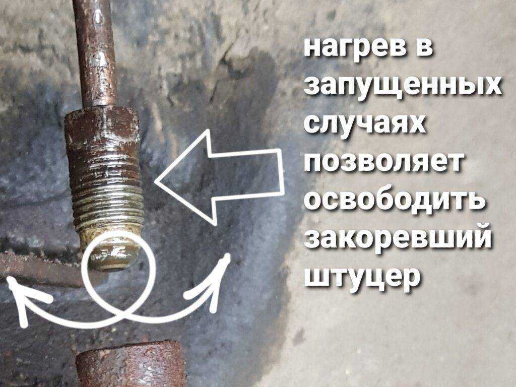Третье. Специальные ключи тормозных трубок должны быть подготовлены заранее. Ключи позволяют плотно обжать грани штуцера, избежав их слизывания. Периодически пытаться стронуть резьбу штуцера относительно фитинга. Именно стронуть, ибо можно свернуть тормозную трубку, закисшую в штуцере. Можно использовать периодические постукивания.