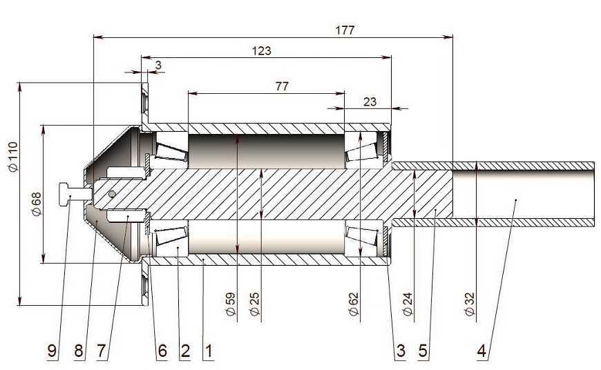 Чертеж любой ступицы достаточно прост для понимания. Труба колесной оси (4) и вал (5) соединяются посредством сварки. Пара роликоподшипников (2) хорошо и надежно защищена от попадания песка и пыли со стороны оси (4) с помощью защитной шайбы (3), а со стороны гайки (7) посредством специального колпака (8), который вставляется в корпус с натягом.