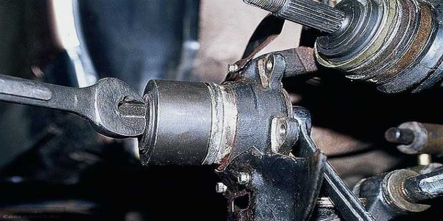 13. Окончательно отверните гайки болтов крепления поворотного кулака к стойке и выньте болты.