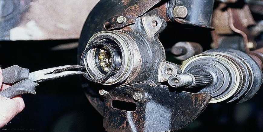 - Стопорное кольцо извлекается щипцами, а после этого снова возникает «вилка» действий: металлический пыльник нужно сбивать только в том случае, если подшипник будет выпрессовываться. Если же было принято решение о выбивании подшипника задней ступицы, то пыльник можно оставить.