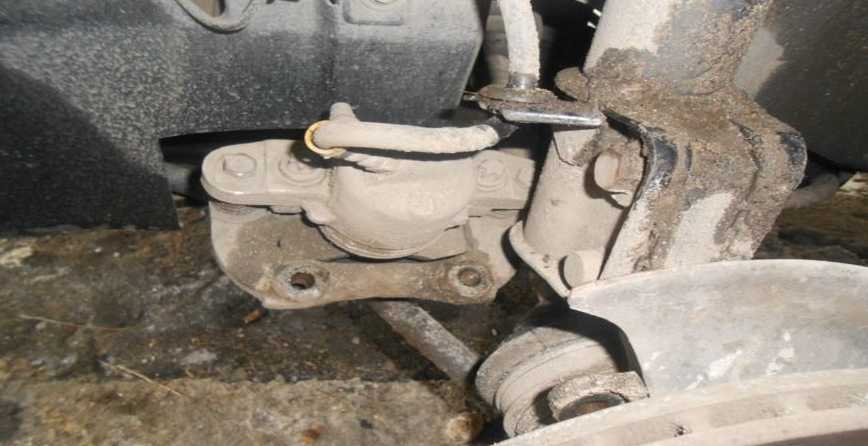Подвяжите суппорт к детали подвески, чтобы исключить его зависание на шланге переднего тормоза. Затем потребуется его отжать отверткой и аккуратно снять с поворотного кулака.