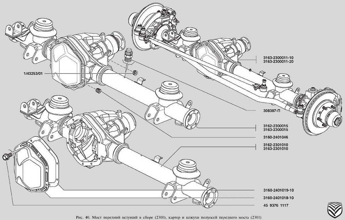 Схема переднего моста УАЗа Патриот, которую можно найти на многочисленных тематических форумах, демонстрирует присутствие большого количества мелких и крупных деталей, которые напрямую оказывают влияние на работу узла в целом. Картер Спайсера (так называется описываемая конструкция) является литым элементом, в который запрессовываются полуоси, а закрывается он при помощи крышки. В нем размещены главная передача и дифференциал, благодаря чему повышается работоспособность узла.
