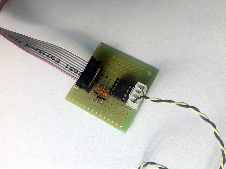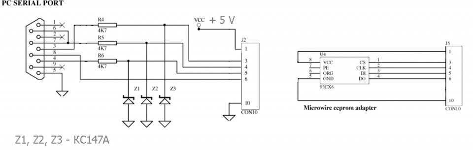 Выпаиваем слабомощным паяльником флешку, аккуратно, не отломив на ней ножки, новые в радиомагазине по 40 рублей Для программирования придется собрать простейший программатор, нужно пару метров проводов, 3 резистора по 4,7кОм, мама СОМ-разъема и 3 стабилитрона, маркировка на схеме.