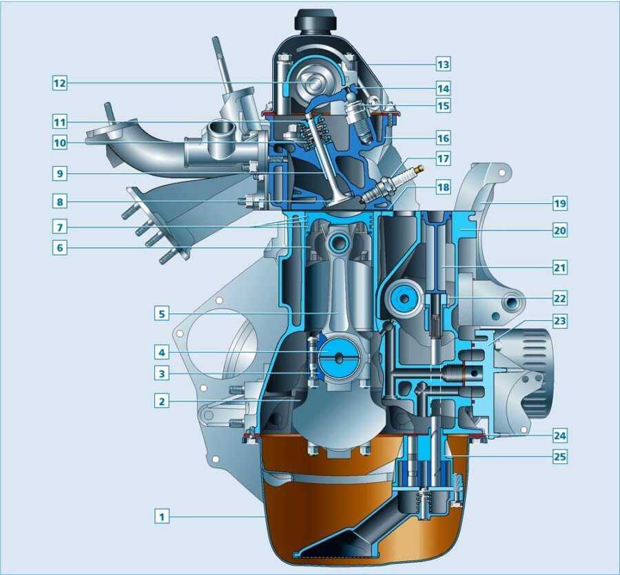 1 — поддон картера; 2 — крышка коренного подшипника; 3 — крышка шатуна; 4 — коленчатый вал; 5 — шатун; 6 — поршень; 7 — поршневые кольца; 8 — клапан; 9 — направляющая втулка клапана; 10 — клапанные пружины; 11 — тарелка; 12 — распределительный вал; 13 — крышка головки блока цилиндров; 14 — рычаг клапана; 15 — гидроопора; 16 — головка блока цилиндров; 17 — свеча зажигания; 18 — прокладка головки блока цилиндров; 19 — кронштейн генератора; 20 — блок цилиндров; 21 — фиксатор шестерни масляного насоса; 22 — шестерня масляного насоса; 23 — кронштейн масляного фильтра; 24 — прокладка поддона картера; 25 — масляный насос