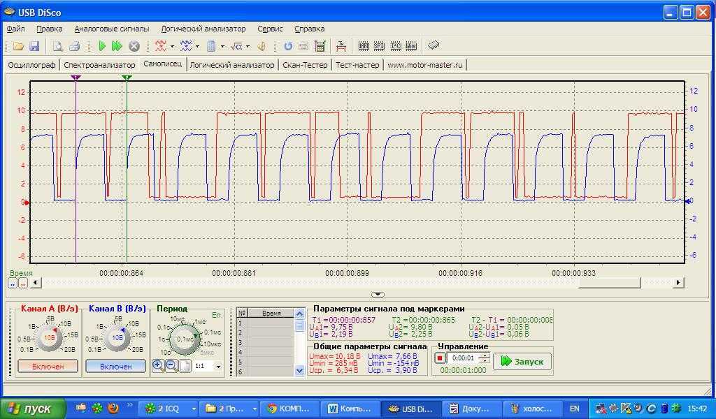 Синяя диаграмма — синий провод, управление с ЭБУ ШИМ. Красная диаграмма — обратная связь по серому проводу, как видим появился сигнал обратной связи.
