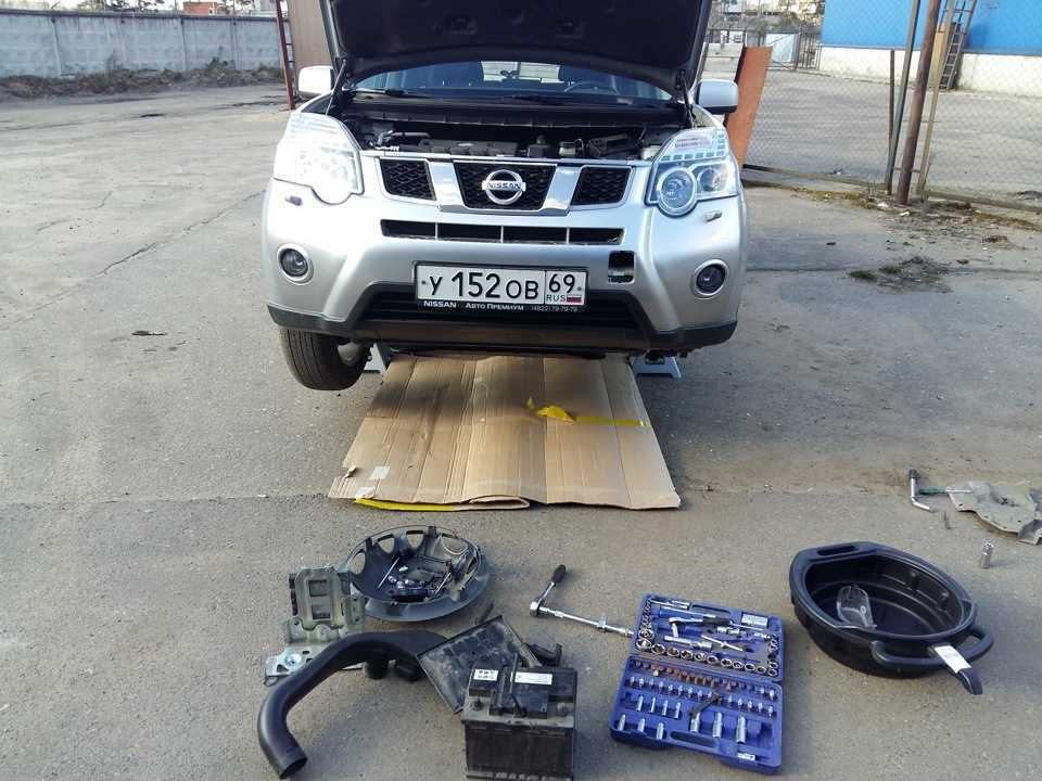 Загоняем ниссан х трейл т31, глушим и принимаем все необходимые меры предосторожности: активируем ручной тормоз, устанавливаем противооткатные упоры под задние колеса.
