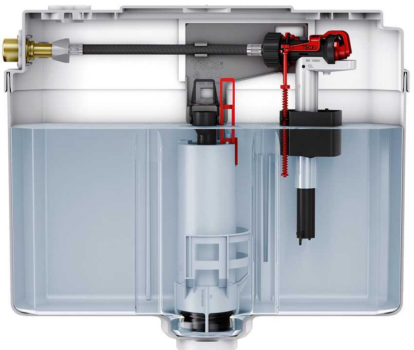 Принцип работы сливного бачка состоит в следующем. Вода поступает в емкость через наливной клапан, который может находиться в стенке или днище бачка. По мере наполнения емкости активируется запорное устройство в виде поплавка или клапана, которое перекрывает подачу жидкости в момент достижения ею определенного уровня, блокируя наливной клапан.
