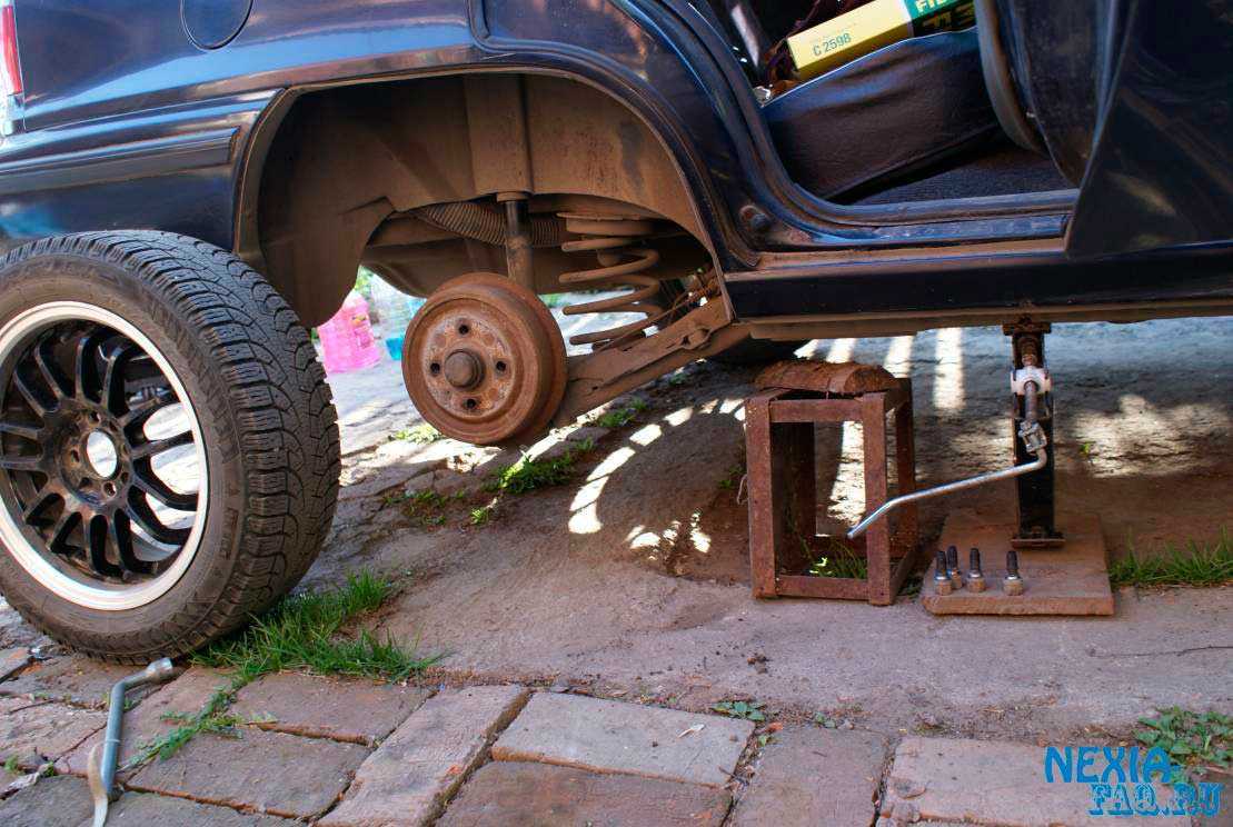 Желательно поставить подставку, чтобы при откручивании болтов машина не шаталась на домкрате |