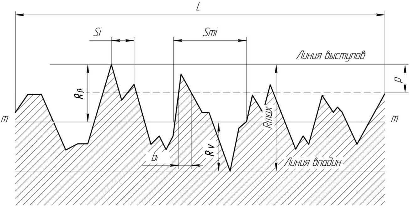 Опорная длина профиля ηp – сумма длин отрезков в пределах базовой длины, отсекаемых на заданном уровне в материале линией, эквидистантной средней линии (рис. 2):